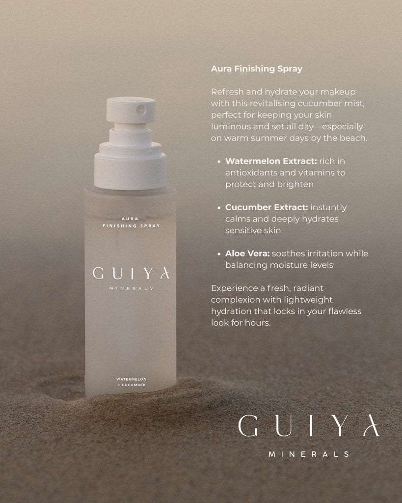 Aura Finishing Spray is your go-to for a flawless, long-lasting finish. Infused with refreshing watermelon and cucumber extracts, it hydrates and locks in your makeup, keeping it fresh all day.